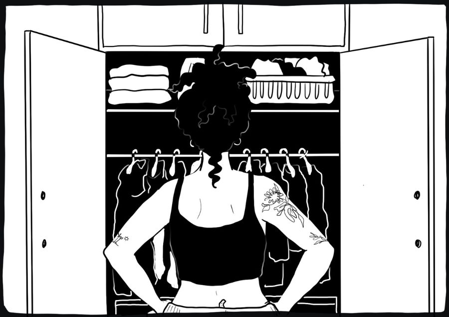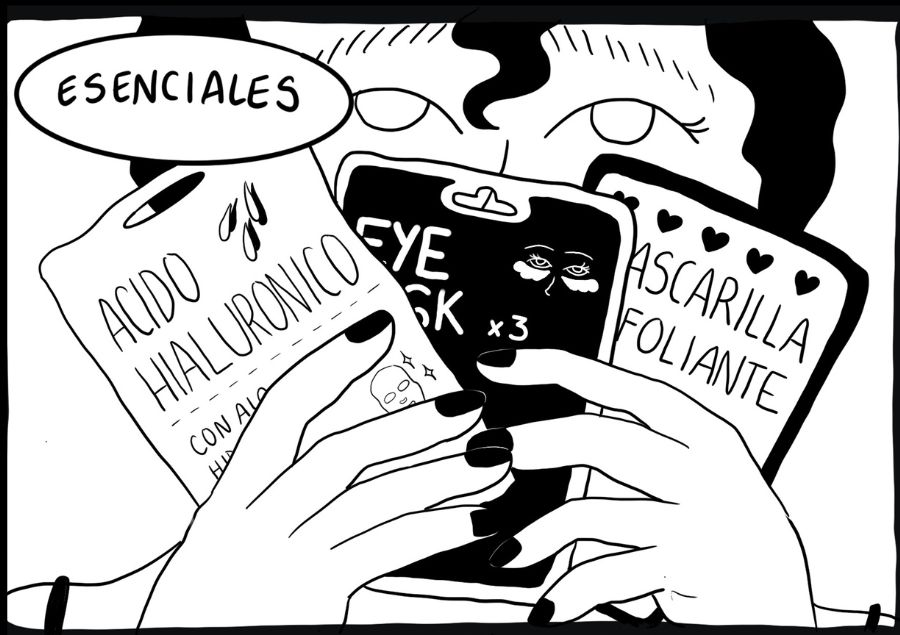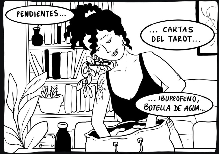 No puedo olvidarme de lo esencial como las mascarillas de cuidado de piel y las cartas del tarot. Un palito de incienso también cae. Cascos, cargador, (noches de desenfreno, mañanas de) ibuprofeno, llaves, cartera.