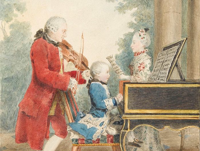 En casa de los Mozart todo era jolgorio cada vez que el padre, Leopoldo, llamaba a sus siete hijos a escena. Uno cogió una carraca; la pequeña, un silbato; el del medio, el pífano, y Wolfgang, el más aplicado de los hermanos, el violín. Aún no había cumplido los nueve años y ya era un virtuoso de este instrumento. De raza le venía al galgo, pues Leopoldo había escrito en 1765 su famoso Tratado completo sobre la técnica del violín, publicado en Augsburgo, que fue traducido a varios idiomas inmediatamente y que Wolfgang había devorado nada más salir de la imprenta. Era intención del bueno de Leopoldo formar a sus hijos en las técnicas y dominios musicales, aunque sólo dos de ellos, Wolfgang y Marie Anne, destacaron.