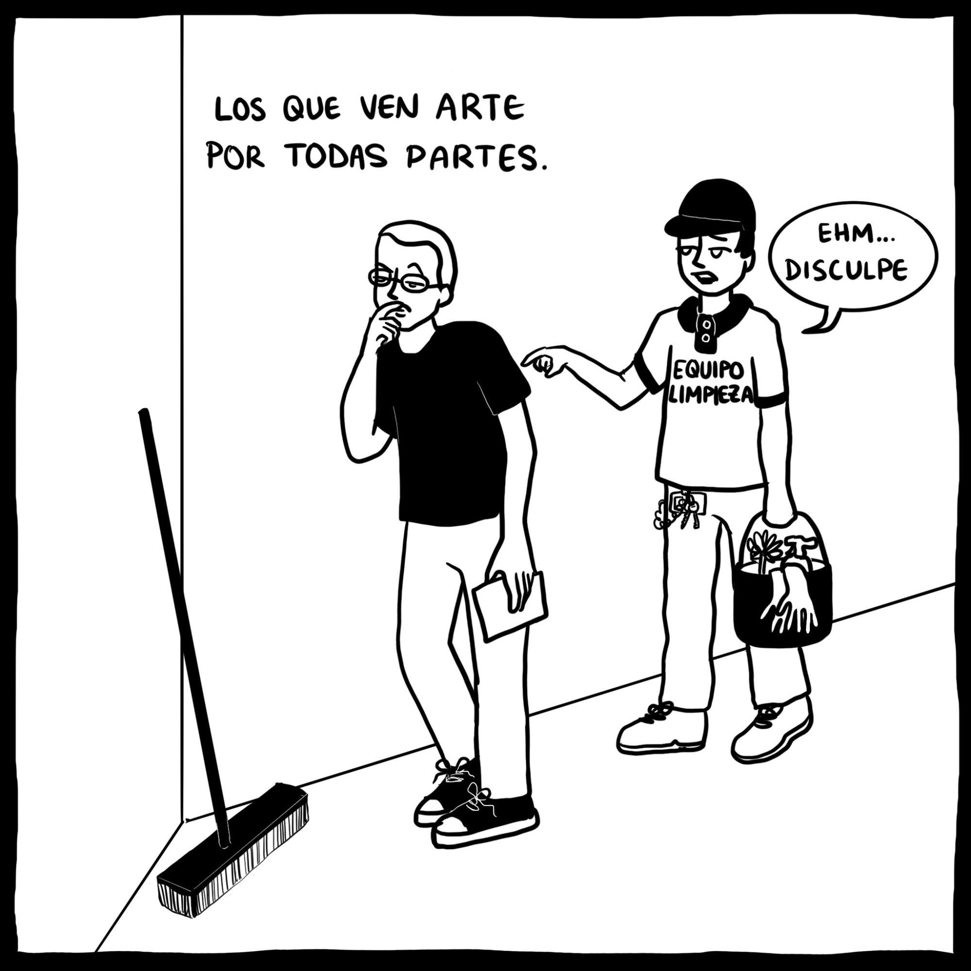 Luego están los que se quedan mirando ensimismados un extintor, una puerta, o la escoba de los de mantenimiento. Quizás son artistas adelantados a su época. Quizás no se han enterado de lo que va la exposición.